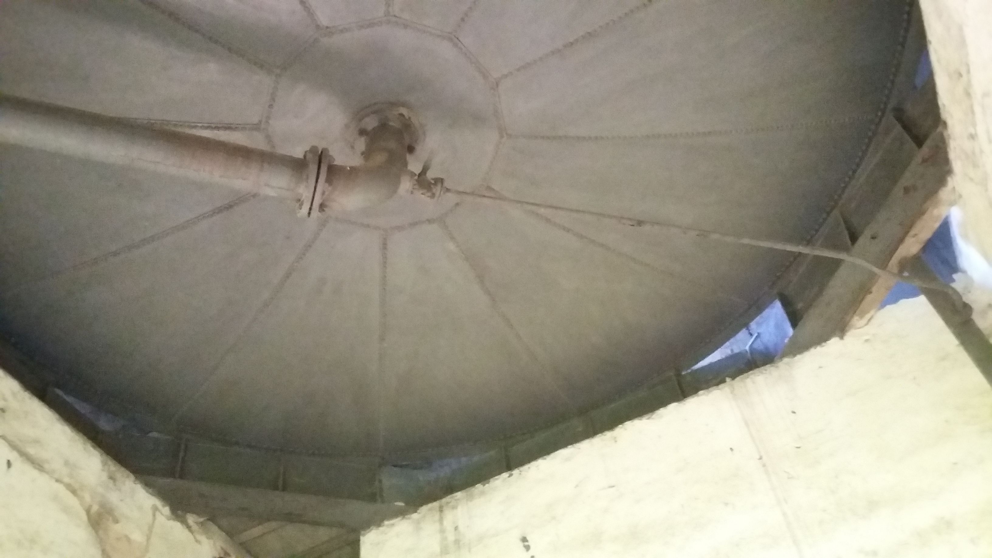 Nádrž na vodu byla usazená v patře vodárny na obvodových zdech, byla určitě ocelová, válcová s klenutým dnem ve tvaru kulového nebo eliptického vrchlíku, nahoře pod krovem otevřená. Jestli byla někdy natřená, tak nanejvýš nějakým základním nátěrem. Fotky z demontáží starých vodáren ukazují už jen rez.