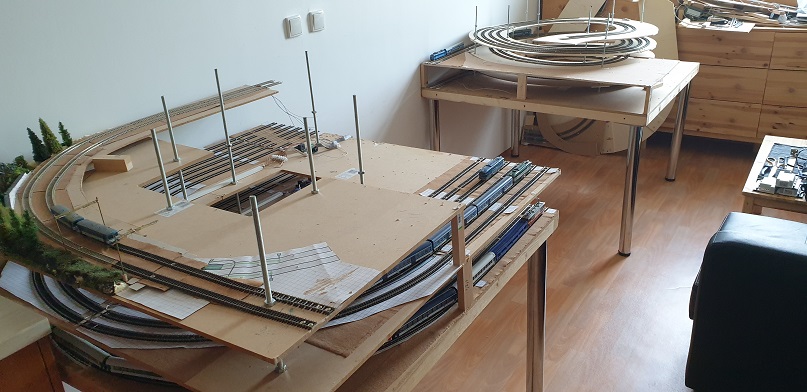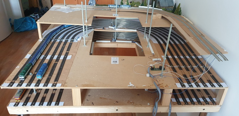 Tak aby nezůstalo jenom u kreslení a plánování, tak začaly práce na vložení středního dílu nutného pro rozšíření kolejiště. Bylo to sice trošku pracné všechno to odstrojit, ale na druhou stranu jsem měl možnost si důkladně všechno zkontrolovat po náročném stěhování. :mrgreen: Zároveň mi to dalo možnost udělat všechny přechody mezi jednotlivými díly kolmé a všechny výhybky umístit na nově budovaný prostřední panel :D