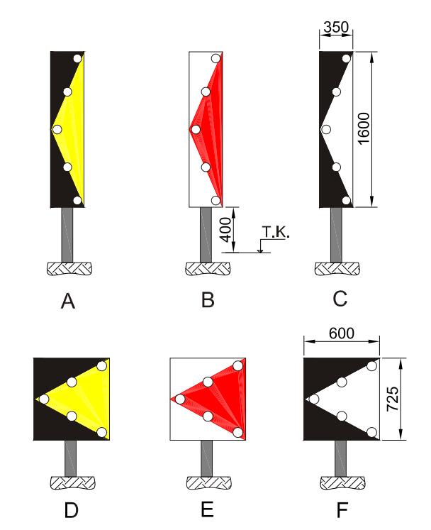 A a D upozorňuje na předvěst, B a E na hlavní návěstidlo, C a F na přejedzník.