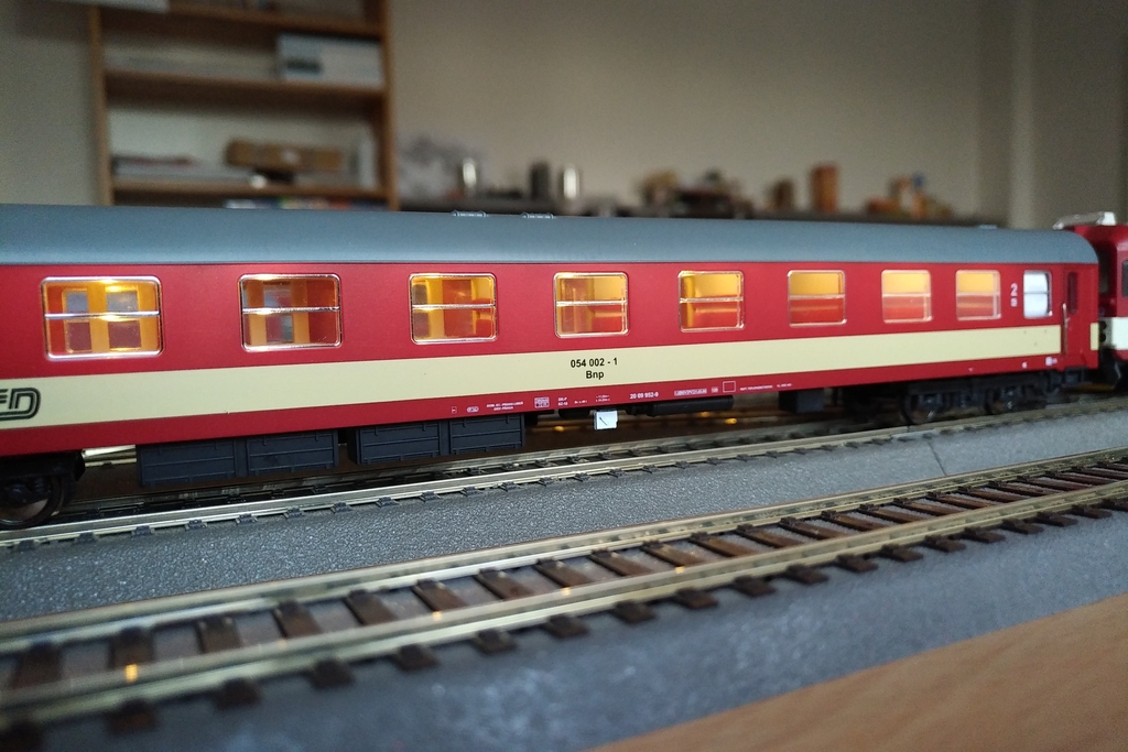 - sedadla. Ve voze jsou pro šest míst v kupé. To ale neplatí pro vozy Bn, tam byly lavice podobné těm v "odporácích", ale červené. Jako nejjednodušší mě napadlo využít sedadla z vozů Tillig s uřezáním podhlavníků a nalepení zvlášť. Bylo nutno vytvořit nové stěny mezi oddíly, což jsem udělal silným kartonem. Na fotce z interiéru jde vidět, že je to trochu šejdrem, ale při pohledu okny do vozu při provozu to není takřka poznat. Holt přesnost práce byla snížena nákazou Covidu během modelaření