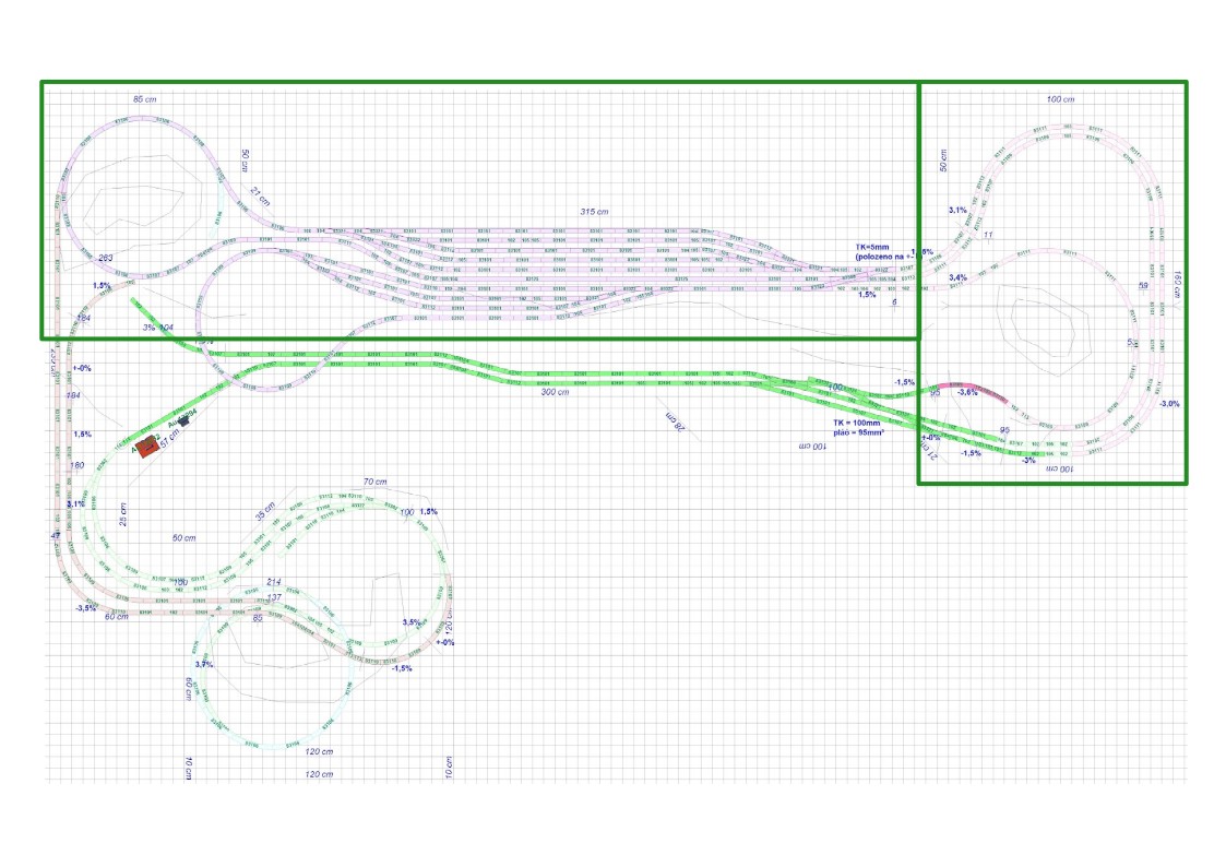 Ve ctvrtek jsem dal do provozu fialova nadrazi vc. kolejoveho krizeni + spojky na jednokolejku. Postavene jsou uz take stoupajici 2kolejka a jednokolejka az skoro po vyhybnu.