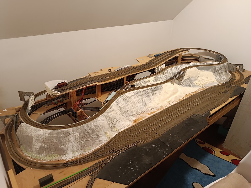 Toto je současný stav kolejiště. S pletivem se dobře pracuje, dá se pěkně tvarovat. Papírové utěrky s disperzí vytvořily tenkou, ale celkem pevnou krustu. Místy jsem doplnil trochou montážní pěny a po zaschnutí ořezal do potřebného tvaru. Snažil jsem se zachovat jen tenký skelet z důvodu přístupu k elektronice. Hnědá barva je eternal smíchaný ze dvou odstínů hnědé. Do posypu přesátou hlínou se mi zatím moc nechce, rád bych se vyhnul využití organického materiálu. Světlá místa budou doplněna skalami, či skalnatými svahy. Vyzkoušel jsem si styrodurové skály dle mnitky, ale víc se mi líbí skály vytvářené ze sádry.