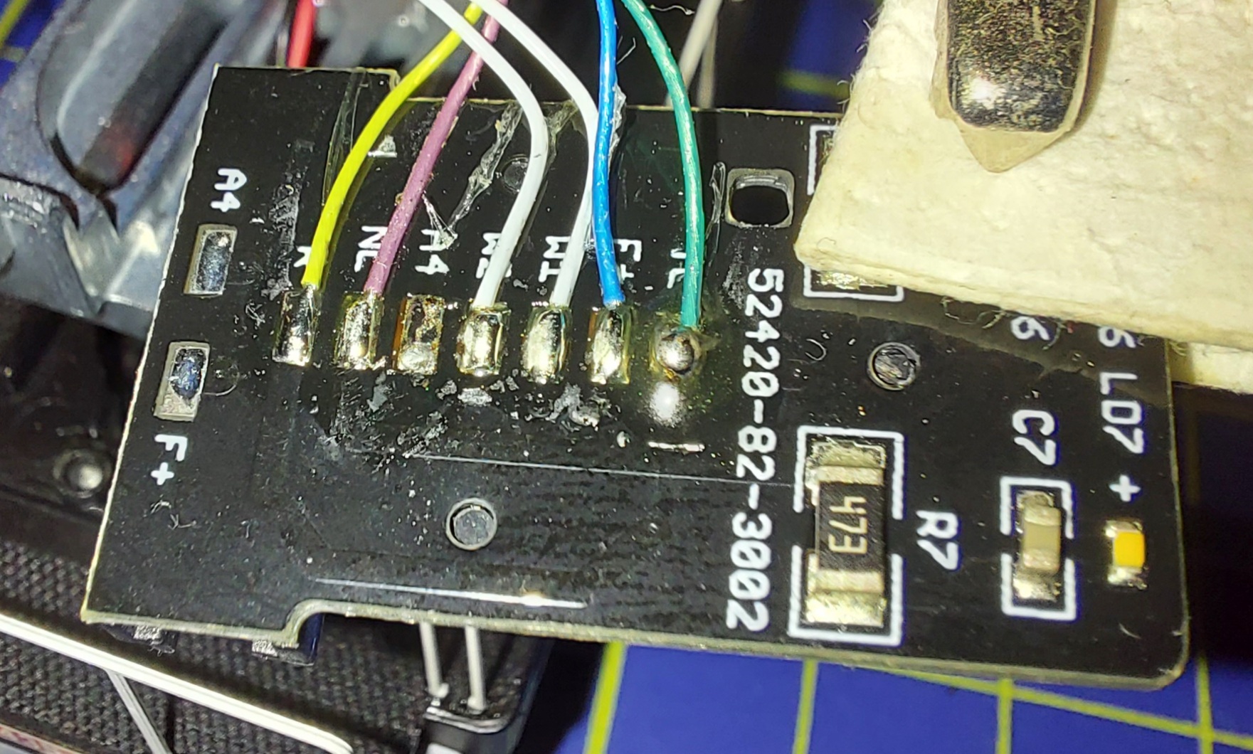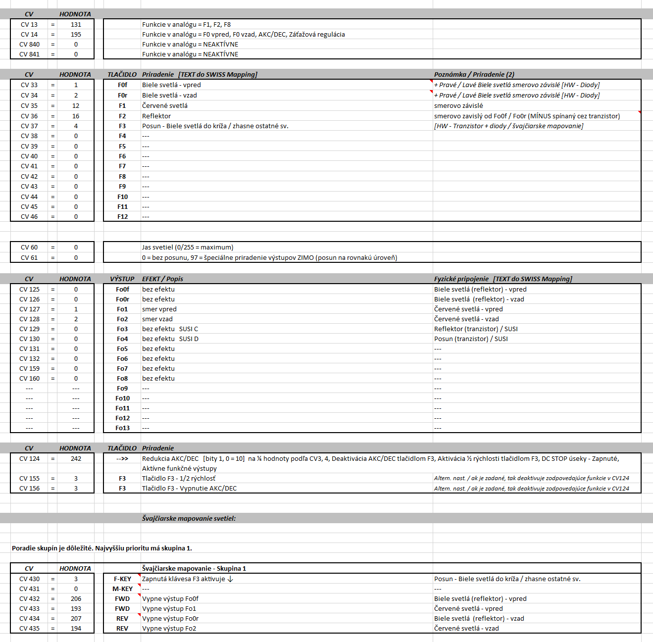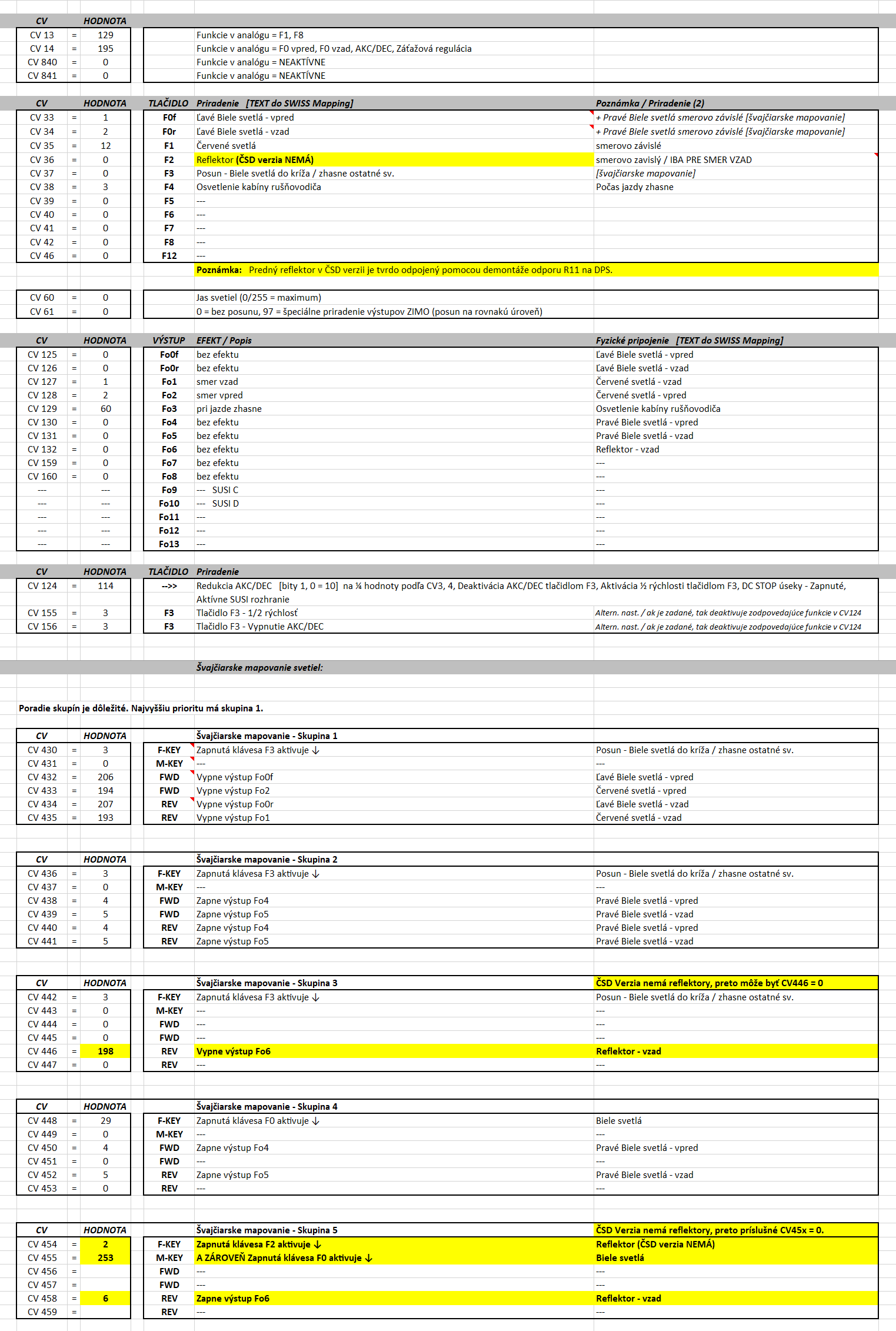 Nato aby to fungovalo, tak som musel z dekodéra vytiahnuť 3 vodiče: SUSI C, SUSI D, GND a následne dekodér zafúknuť do zmršťovačky. Hlavnú DPS som kompletne "očistil" od súčiastok včítane začiernenej žiarovky (tepelne závislý odpor). Ostala iba LED reflektora, ale bez odporu. Na miesto pripojenej žiarovky prišla prepojovacia klema. Čelné DPS s LED som taktiež "očistil" od všetkých odporov a vodičov. Jediný čo zostal bol spoločný (+) pól. Nachystal som si nové dlhé vodiče pre pravé svetlo (modrý/fialový), ľavé svetlo (žltý/biely), červené svetlá (zelený/hnedý). Reflektorové LED dostali tiež nové vodiče (šedý/čierny). Poradie farieb je uvedené pre zadné/ predné čelo. Jednotlivé vodiče som vyzväzkoval aby na DPS nebolo seno a pripojil na pomocnú DPS. Silové výstupy Fo0f a Fo0r som prepojil zo základnej DPS na pomocnú. Zelený vodič (červené sv.) som pripojil na rezervný PIN pätice 8-PIN. Hnedý vodič dekodéra som spojil s hnedým vodičom od druhých červených svetiel. Ešte som pripojil na pomocnú DPS dopĺňané vodiče z dekodéra SUSI C (čierny) a SUSI D (šedý) + GND (oranžový). Na záver som po naprogramovaní CV a odskúšaní výstupov odmeral prúd a napätie na LED zrazené pomocou trimra tak, aby LED adekvátne silno svietila a "žrala" čo najnižší prúd. Následne som osadil pevné odpory. Tiež aj pre červené svetlá na čelnej DPS. Došolichal som švajčiarske mapovanie aby bolo všetko tak ako má byť.