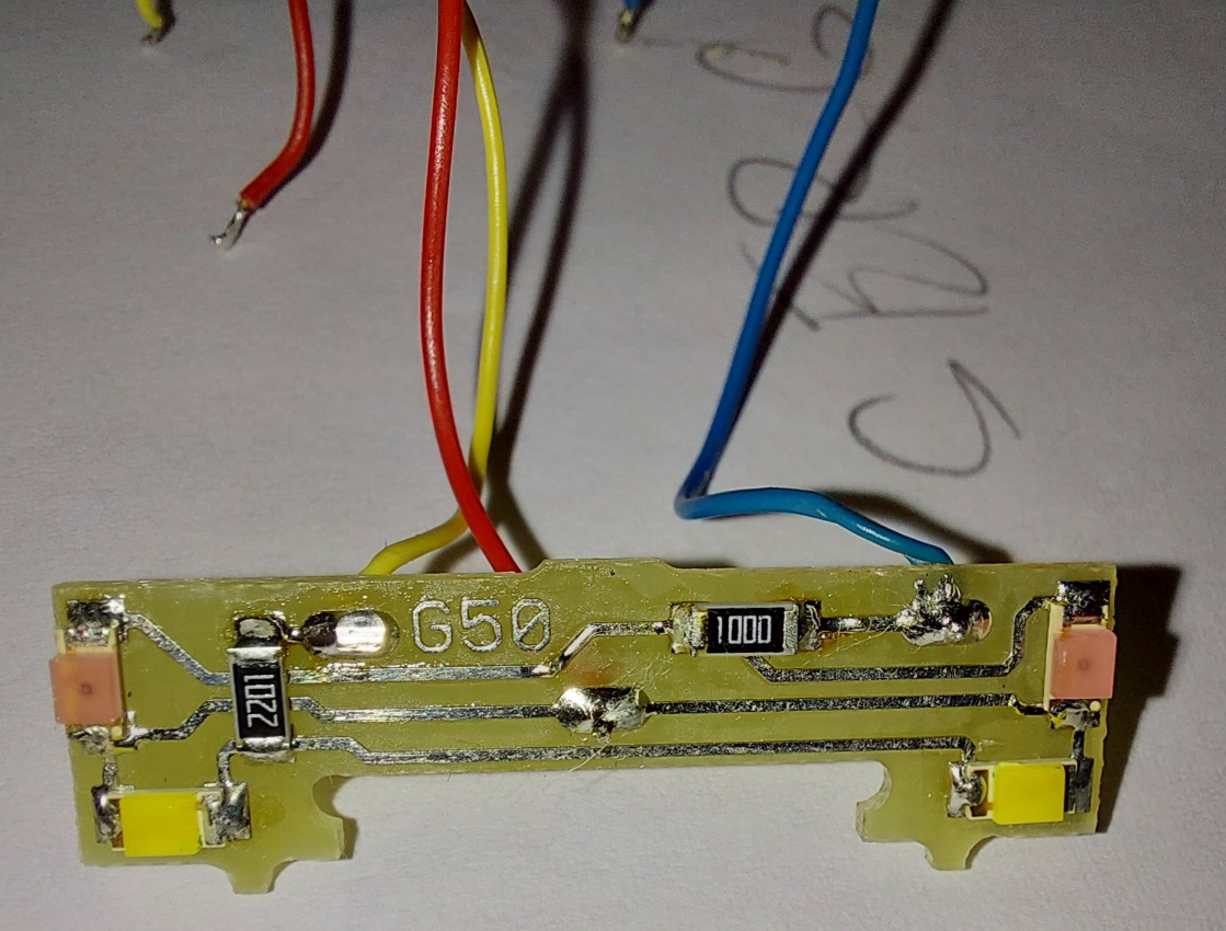Aktuálny model od FISCHER MODELL má už osadenú DPS s PluX22 konektorom, ale svetlá rovnako blbo - 3 biele a 2 červené - pekne spolu spojené.
