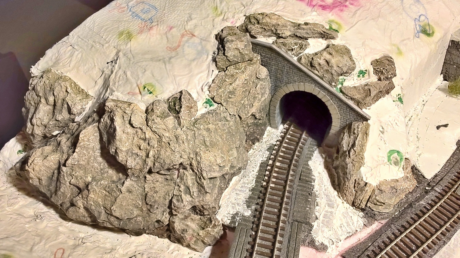 Osobně bych od vlečkové koleje někde pod tou nažloutlou břízou přidal aspoň navrch kus skal či terénu celkově aby se masiv nad portálem jevil mohutnější, dál se to už trochu pod stromy ztratí ale i kdyby 5-10 cm od kraje bylo vyšších o nějaké 3-4 cm ( směrem dozadu k SN to klidně zase můžeš stáhnout dolu ) rozhodně by to pohledově prospělo. ;)