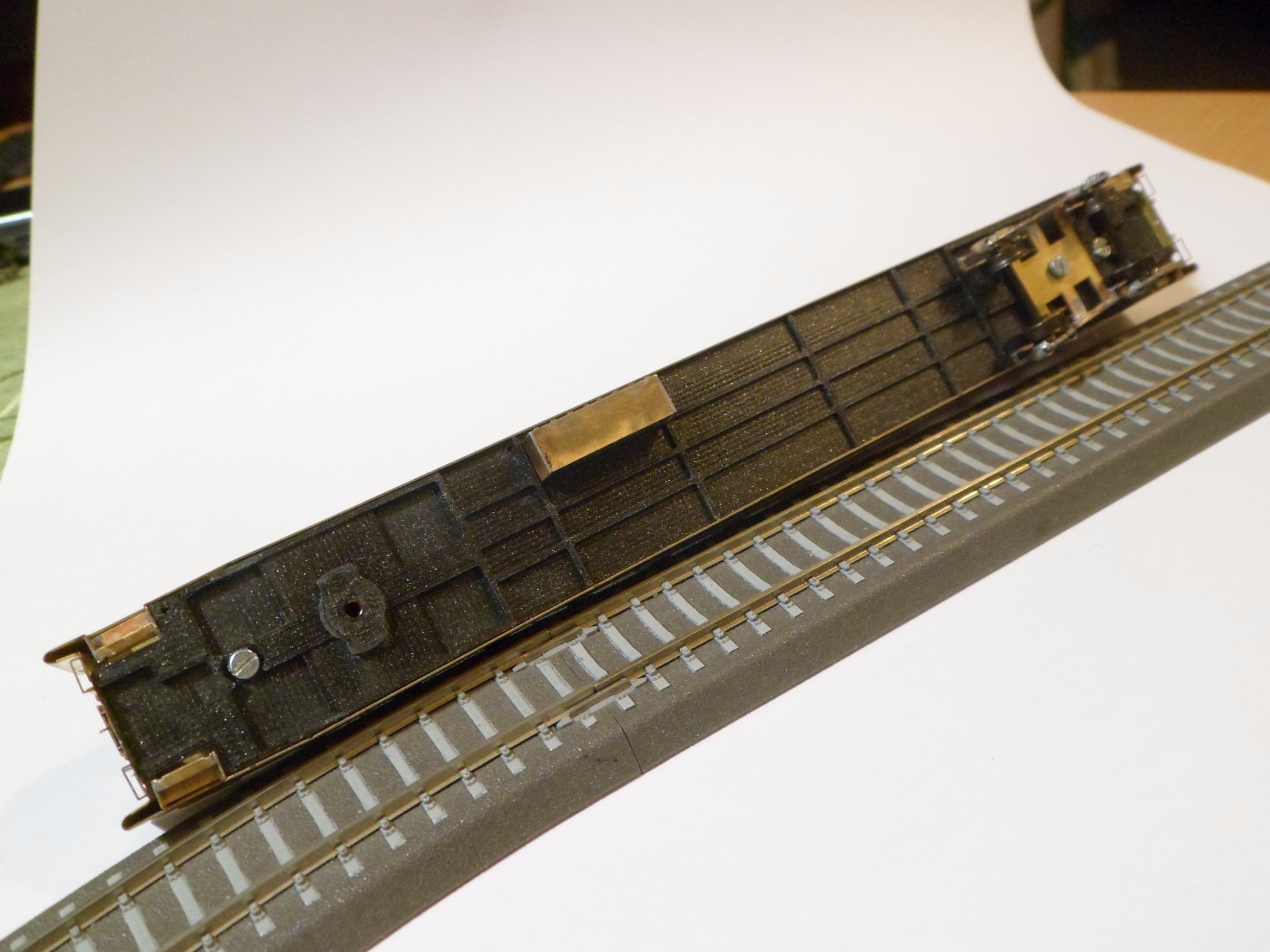 Na spodku zatím chybí alespoň náznak brzdové výstroje... Na podvozcích jsem nemodeloval čísti, které nejsou vidět při pohledu na vůz. Vynechal jsem příčníky vně dvojkolí, na vnější straně by stejně kolidovaly s kinematikou. Ve střědní části jsem oproti tomu podvozek vyztužil pro lepší mechanickou odolnost. Dvojkolí jsou uložena v PEHO ložiskách.