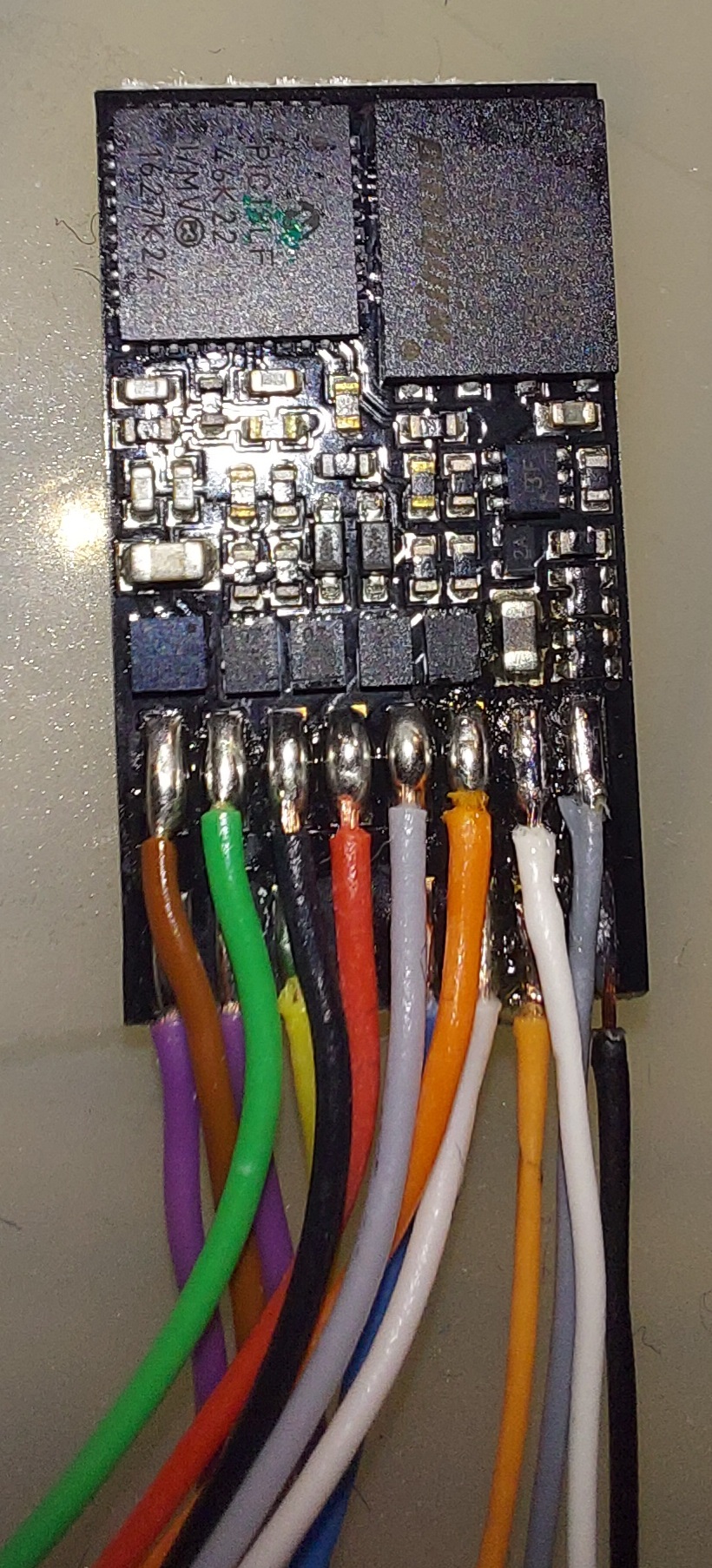 ZIMO MX648R s doplnenými vodičmi SUSI C, D, GND a Fo3 (4 vodiče na pravej strane)