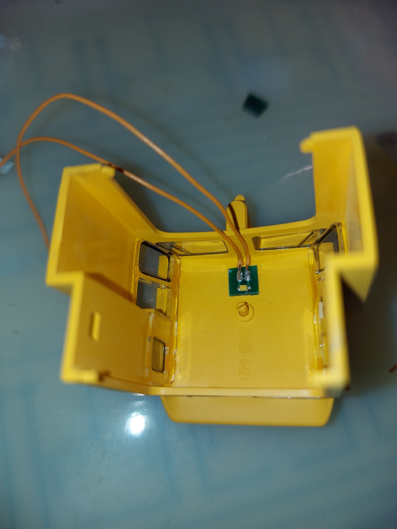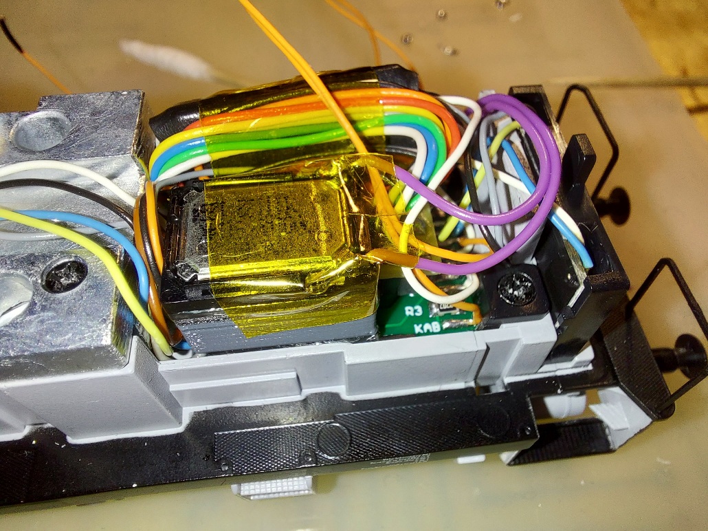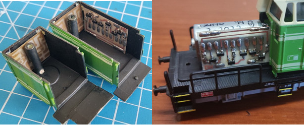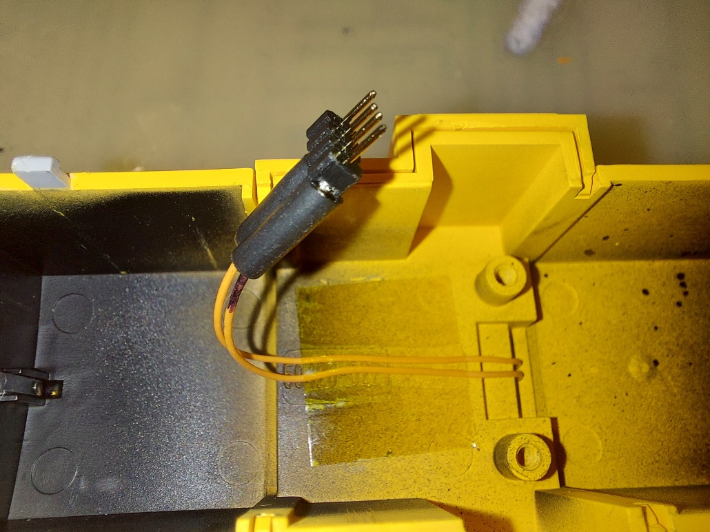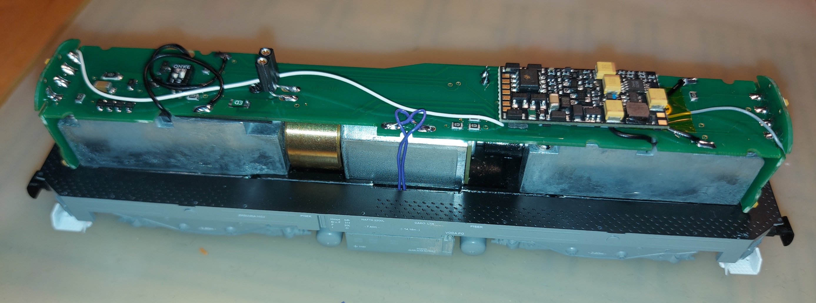 Nebudem sa opakovať, iba skonštatujem, že predmetom úprav bolo dosiahnuť osvetlenie pre posun (pravé biele svetlo do kríža na oboch čelách). V tomto prípade to bolo úplne jednoduché, pretože na hlavnej DPS boli voľné funkčné výstupy Fo6 a Fo7. Takže nie sú potrebné žiadne tranzistory ani SUSI výstupy. Postačí odškriabať pravú bielu LED na čelných osvetľovacích doskách – osamostatniť ju od ľavej bielej a reflektorovej LED. Pri výstupoch z dekodéra (pätici) navŕtame dve dierky na vodiče – tie pripojíme na pravé biele LED na čelách. Okrem toho je nutné osadiť reproduktor (kocka ZIMO výšky 7mm vôjde do nádrže) + LED interiéru. Stačí poohýbať nožičky LED a skrátiť, potom sa LED zasunie do prispájkovaného konektora. Určite existujú aj iné metódy, ja som použil toto riešenie.