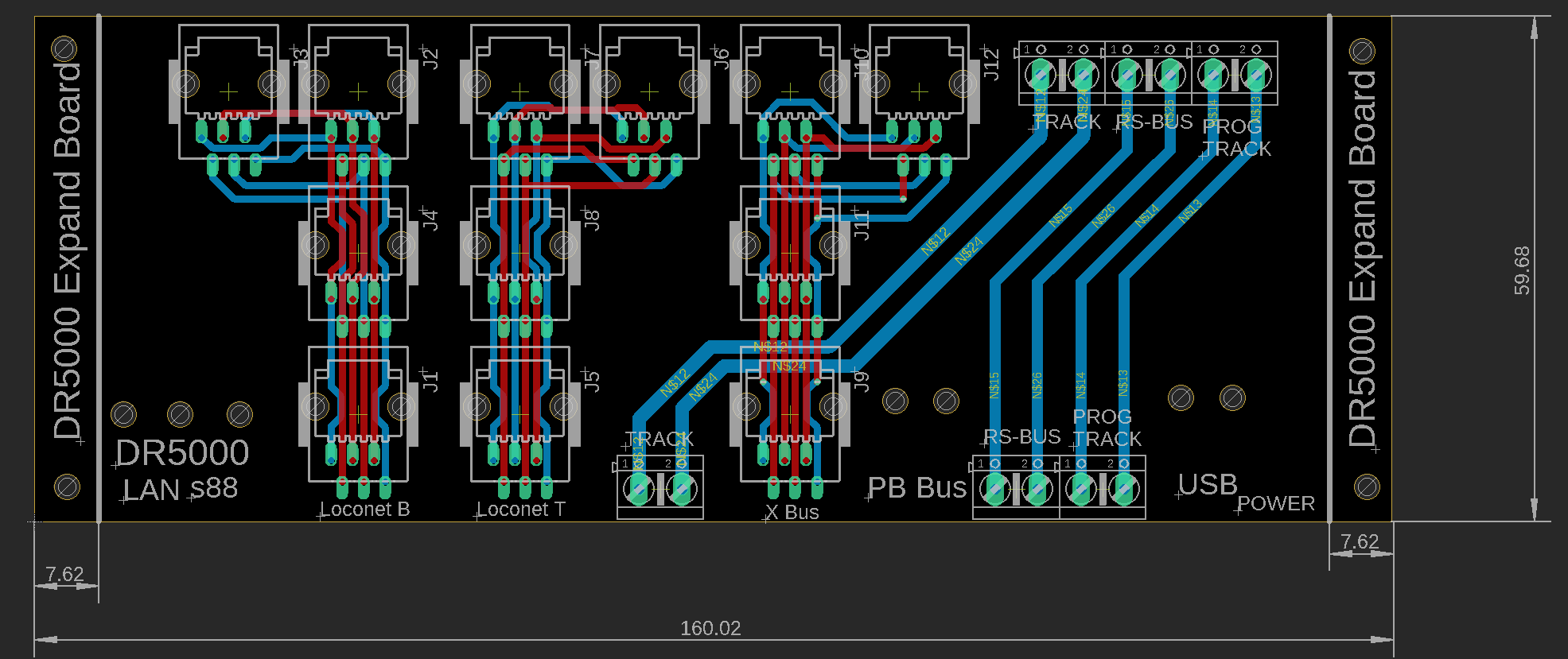 Ty konektory RJ směrem ven bych nedával až k hraně dps. Nechal bych tam 10-15 mm na možné upevnění kabelů, aby nebyly konektory mechanicky namáhané. A vodiče Track pro napájení kolejiště co nejsilnější.