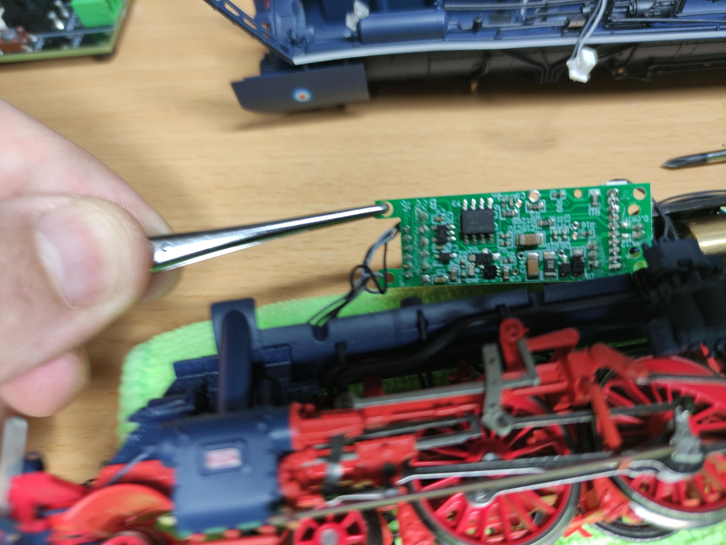 V loko je deska, která je téměř stejně složitá, jako dekodér. Je na ní můstkový usměrňovač a impulzní zdroj (DC/DC converter), ten je na spodní straně desky. Takže LOKO má opravdu svůj napájecí zdroj. Pak je tam 16-bitový MCU, který zřejmě bude tím extenderem pro SUSI, tj. pro nás černá skřínka. Ten řídí přes tranzistory generátor kouře a další výstupy, Do této základní desky vedou všechny vodiče z tendru, K desce je přes konektor připojen gen.kouře a další pomocná destička, na které je několik diod a rezistorů, z ní vedou vodiče k reflektoru, osvětlení kabiny a imitace topeniště. Deska gen.kouře má 6 pinů - napájení motorku ventilátoru, topný rezistor a teplotní čidlo.