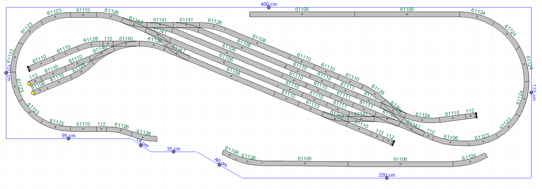 je to pro rozměr 280x140 vyhýbky jsou 15st obyč a obloukové 12st. vše Elite a radiusy jsou velkorysejší nejprudší je ta kusá u továrny r484 jinak ve viditelné části je vše r543, r602 nebo z flexi ještě více, takže do geoline by to mělo jít polámat. Má to i zajímavě řešené podzemí, jsou tam velice pěkně zapasované dvě smyčky s tím že to má 3 podvarianty, které se liší jen přidáním vyhýbek.