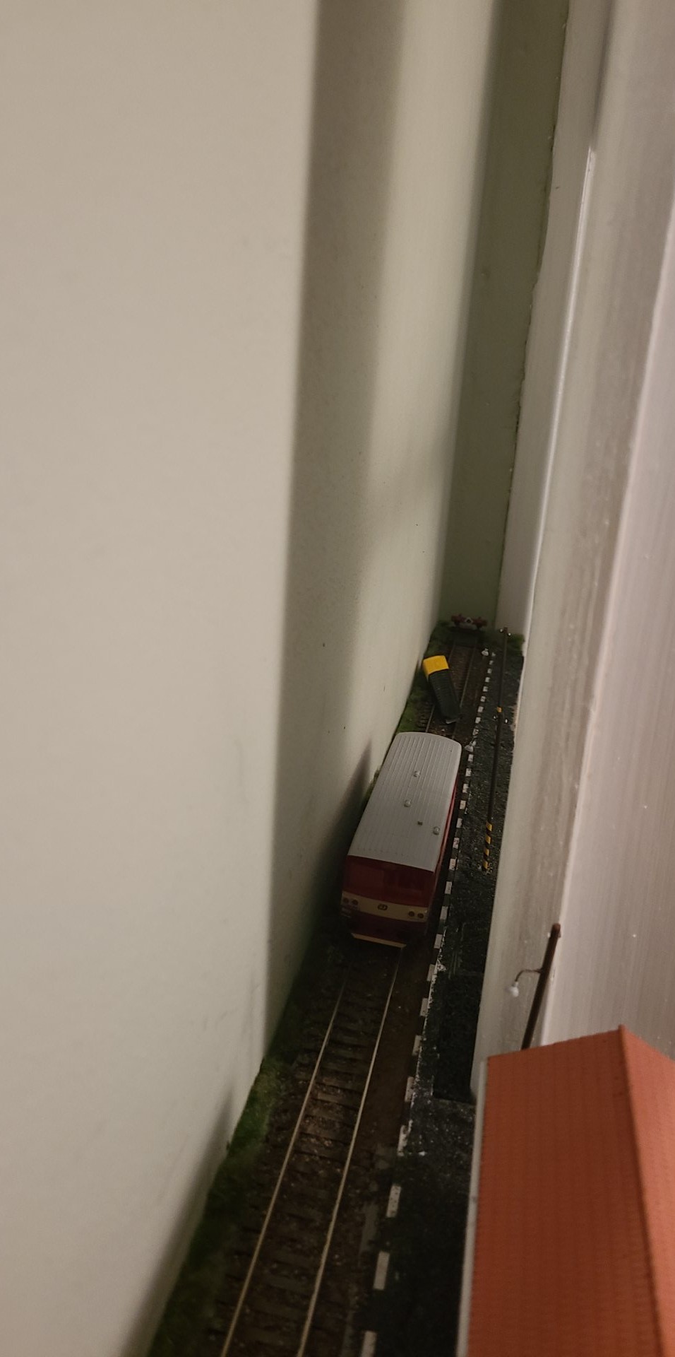 Párkrát jsem projel celou trať a přišla mi škoda, pro ozvučené soupravy, mít jenom půlkruh. Jak to vyřešit? Druhé patro! Stoupání schované za pozadím, okolo dveří padací most, a hurá, může se jezdit dál