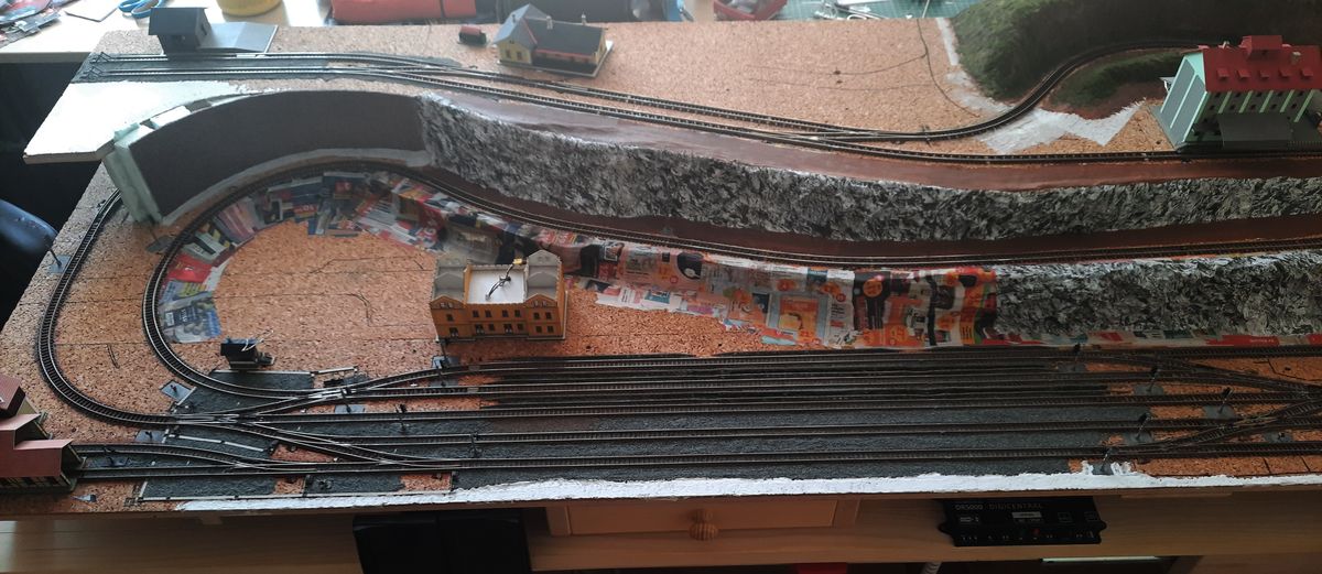 3. Co bude na druhé straně kolejí? Chtělo by to aspoň terén par cm nad tratí, aby vzniknul zářez. Zkus si představit původní terén. Rovina a 16m zdi opravdu příliš bije do očí. I město nebo parčík muže být na svahu od dolního nádraží.