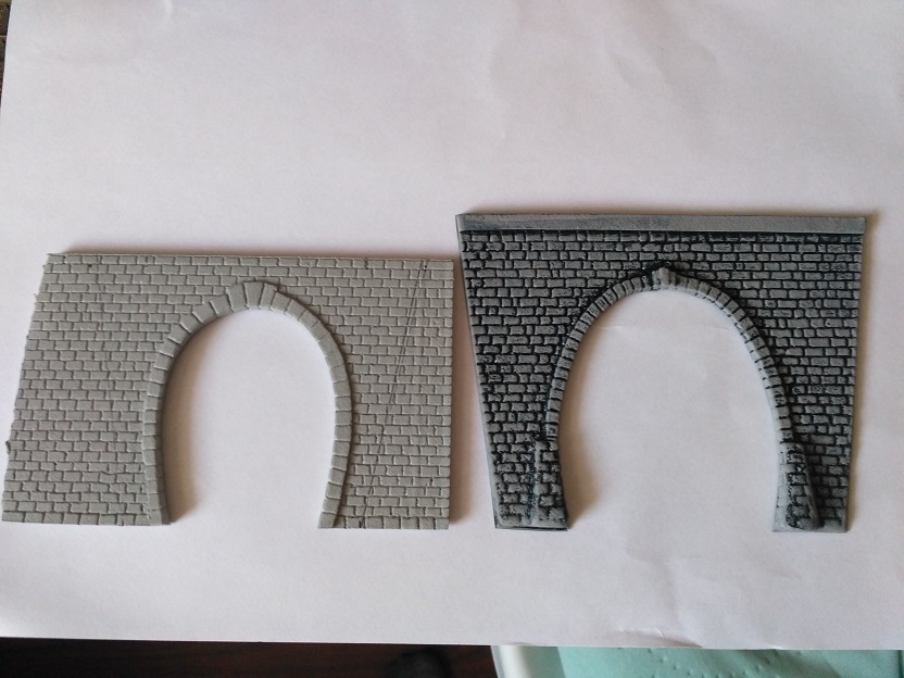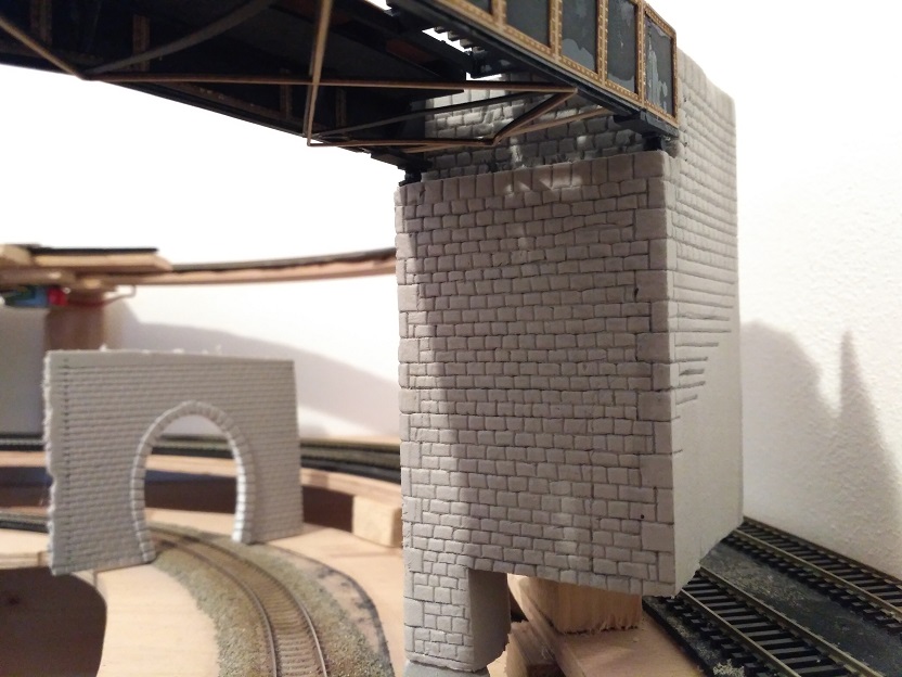 Pro povrchovku používám eternal - mat akrylátový, vodou ředitelný. Nejprve tvrdým štětcem světle šedý (ta bude viditelná ve spárách), pak houbičkou tmavší v různých odstínech (pokud možno spáry nezamazat). Není třeba se bát a skutečně to tam naflákat. V případě potřeby vytáhnu zase spáry řídkou světlou šedou, rozsáhlá zeď i tím získá patinu a reálný vzhled. Kvádry na hranách jsem konkrétně u prvního mostního pilíře (viz několik příspěvků výše) udělal tmavší, jakože z tvrdšího a přesně opracovaného kamene. Pak následuje citlivá patina, např. velmi zředěnou zemitě hnědou, řídkou barvou mechu, stékance tmavé rzi pod ocelovou mostní konstrukcí apod.