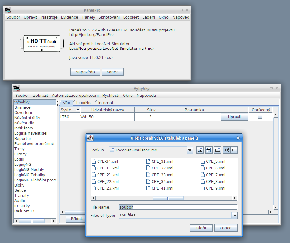 Cokoliv vytvoříme nebo změníme v panelech nebo tabulkách je dobré (nutné) průběžně ukládat do souboru. Všechny použité panely a tabulky se ukládají do jednoho společného souboru XML. Dialog pro ukládání spustíme buď z menu
