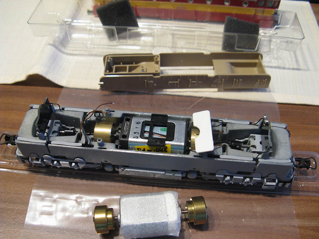 Taky jsem motor vyměňoval za původní 85112, fotek mám ale minimum. Je potřeba ještě podložka 106116 a dva kardany 87171. Kardany se dají na potřebnou délku (naměřil jsem 21,16 mm) zkrátit, pak obě části nasunout do kovové trubičky a zalepit vteřiňákem. Jaký to má vliv na vyvážení nemám ponětí, asi žádný, nepozoroval jsem žádné negativní jevy > hmotnost původního kardanu je 0,19 gram, hmotnost upraveného 0,24 gram :D Nový motor jde do rámu normálně vložit. Bylo zde psáno, že má podélnou vůli kvůli absenci aretačních kolíčků vespod rámu. Ano, to má, ale nikdy jsem nepozoroval, že by se vůle vymezila a hnací ústrojí se opřelo o ložisko šneku na jedné nebo na druhé straně. Ale asi se to stát může, kardany mohou mít nějakou toleranci v délce. V mém případě zůstala vždy u všech výměn v obou krajních polohách minimální vůle. Motor jsem zkoušel fixovat plochou podložkou, ale nakonec jsem jí nepoužil. Jde také z boku olepit samolepicí páskou, jak to dělá Roco u čínských motorů. Nicméně jsem zjistil, že po přišroubování desky s plošnými spoji se motor nehnul. Pružinky k motoru jsou 116812, já jsem vždy použil ty od motoru čínského, jednu jsem co nejvíc stlačil, druhou opatrně natáhnul.