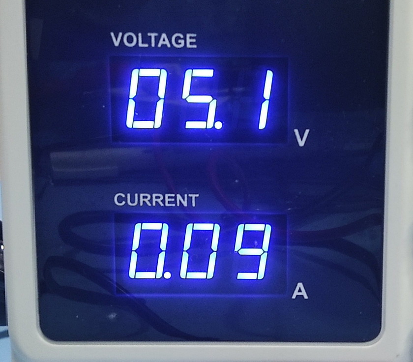 Pro jistotu jsem kolejový ovál napájel laboratorním zdrojem s plynule nastavitelným ss napětím a s displejem ampérmetru pro průběžné kontrolní sledování aktuálně odebíraného proudu (a s aktivovanou proudovou pojistkou uživatelsky nastavenou na 1 A).