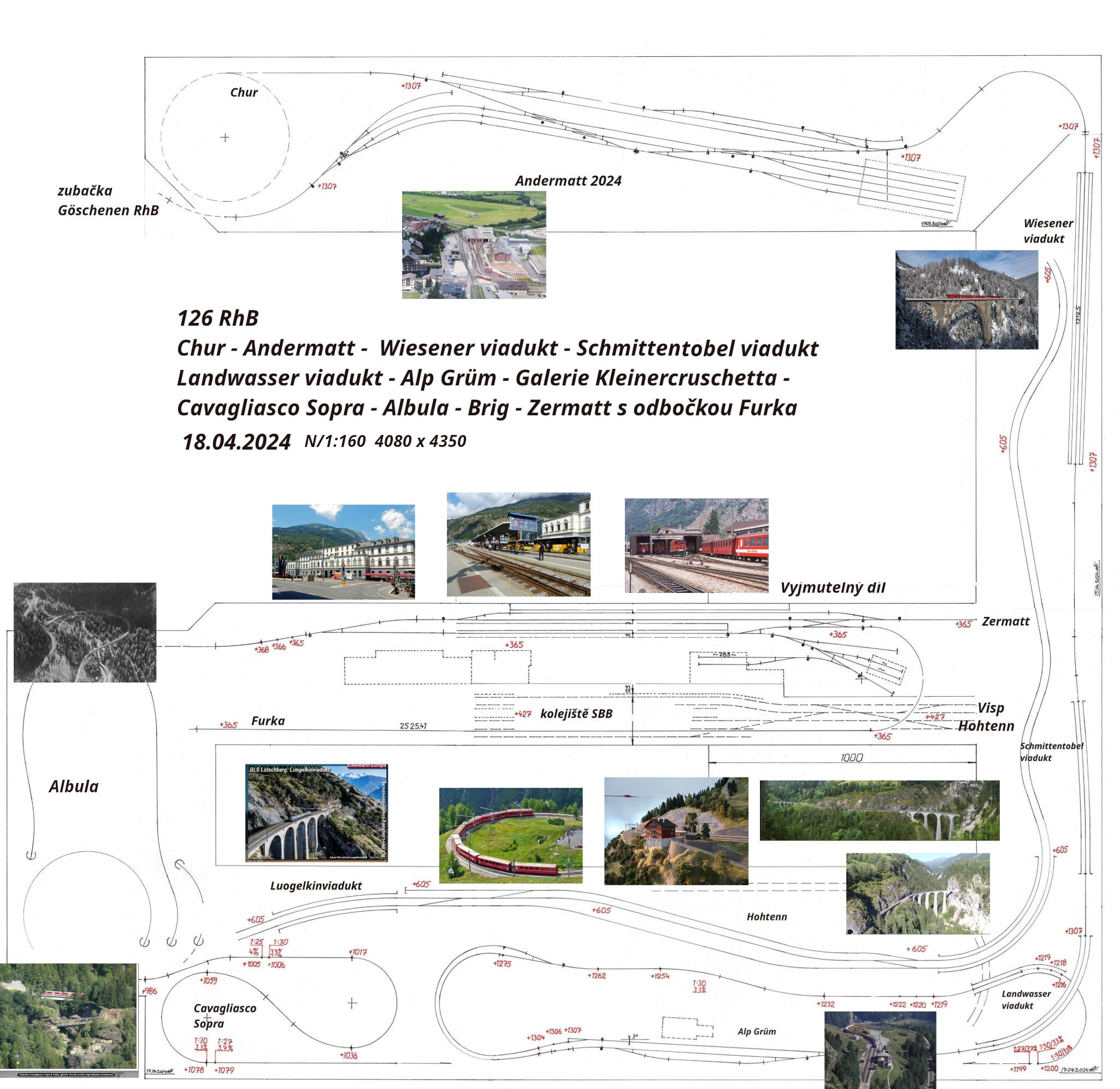 Kolejově je projekt dokončen. V sedmi SN jde odstavit 122 vlakových souprav SBB a RhB. Trochu jsem si pohrál s obrázky, jak by mohlo budoucí kolejiště vypadat. Viditelná stanice Göschenen je schovaná pod stanici Andermatt.