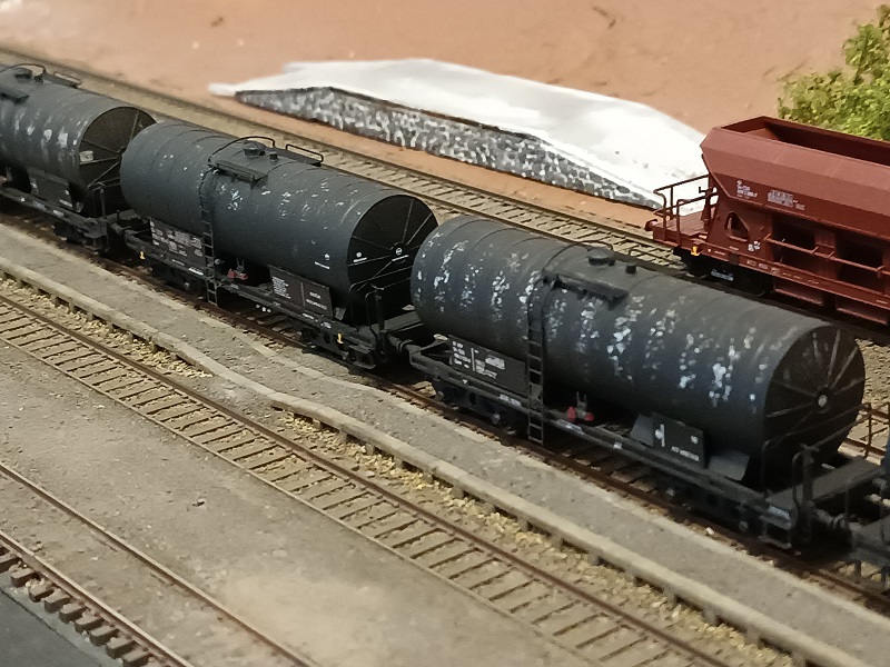 Zde si dovolím malé srovnání odstínů červeno-hnědé barvy nákladních vozů. Myslím, že budu používat odstín viz Vsa, je to Life Color 50347 (ČSD Rotbraun ČSN 8440). Sypák Faccs je výrobkem LOCO. Wap je nastříkaný základovkou Vallejo 73.605 (Rotbraun RAL 8012) a čeká na patinaci. "Zetka" je červenohnědá akrylová základovka ve spreji, zn. myslím Duplicolor. Ta je dle mého názoru též dobře využitelná, za předpokladu alespoň základní lehké patiny třeba pomocí olejovek.