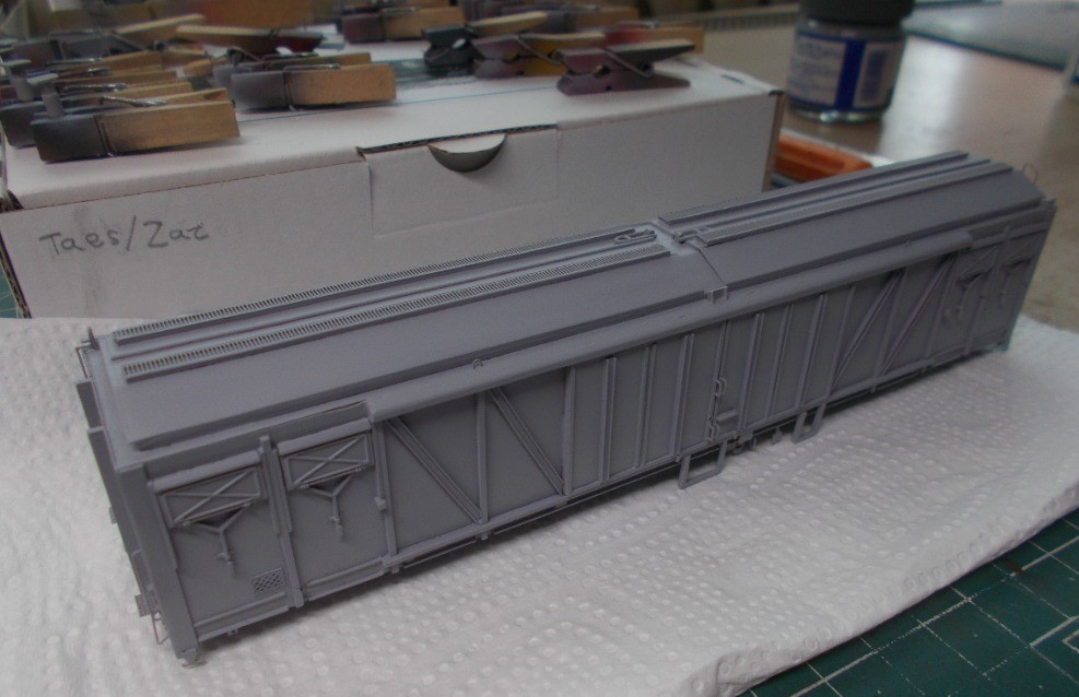 Tak jsem trochu pokročil ve stavbě vozu Taes/Zaz. Dosazené jsou lepty od pana Maliny, vyrobeny madla z drátků a další drobnosti. Madla i ostatní drobnosti nelepím natupo, ale vše zalepuji do předvrtaných dírek a i když se to nezdá, na model bylo potřeba rozměřit a vyvrtat přes šedesát dírek vrtáčkem 0,4 mm. Docela dost drobných dílků zatím kvůli barvení není osazeno. Mám nastříkáno základem a teď mě čeká to nejtěžší, postupně nastříkat a vymaskovat stříbrnou, červenou a černou barvu, tak snad se to povede.