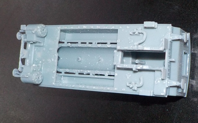 Detaily spodku při úpravách vzaly za svý - vzhledem k provoznímu použití udělám schůdky trochu masivnější, na pojezd nakamufluju opadané díly rámu (z evrgreenu) a čelníků, dolepím světla (jen atrapy), na střechu budky doplním druhý ventilační světlík a zadekluju střední "okno" v zadní stěně budky.