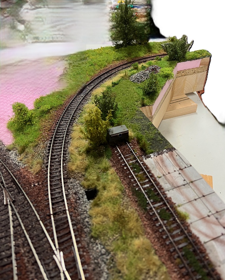 Bod, na který jsem ale vůbec nesáhl, bylo zahájení výstavby nádraží v Rudné. V době, kdy jsem to měl v plánu jsem se rozhodl celkově upravit trať vedoucí směrem na Hostivice. V průběhu ať už zkušebních nebo i provozních setkání s kamarády totiž v této části často docházelo k rozpojování souprav, případně vykolejování a některé lokomotivy zde drhly pluhy, nebo zůstaly vyset. Pro tato setkání totiž trať nekončí tímto provotočivým obloukem, ale je zde napojena na ocelový most, který ji převádí na jiný stůl. Zde je ze zbylého kolejiva ze start setů provizorně poskládána stanice Litovice. Trať pak ještě pokračuje do velké vratné smyčky symbolizující Hostivice. Bohužel výška tohoto stolu a mého segmentového kolejiště není totožná a tak most tvoří zároveň i výškové vyrovnání. Bohužel jeho délka není až tak dlouhá, aby tento úsek splnil veškerá sklonová doporučení a tak v místech napojení vznikly výrazné ostré přechody, kde docházelo k výše zmíněným problémům. Pár setkání jsme to s přivýráním očí tolerovali, trochu si vypomáhali dodatečným vypokládáním na Litovické straně, ale už toho bylo dost. Z výše popsaného jsem proto tento oblouk vytrhal a celý přepracoval a rovnou do něj už zapracoval klesání. No a když už jsem v tom byl, tak jsem krajinou osadil rovnou celý tento úsek, místo původně plánovaných perónů.