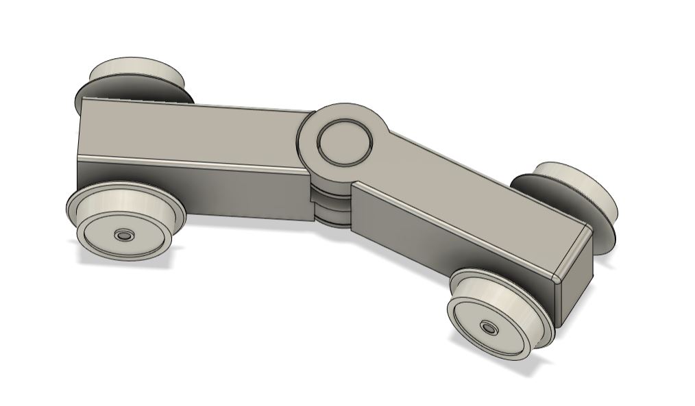Mě teda ještě napadlo udělat něco takovéhleho, ale nejsem schopen vyhodnotit, zda by to fungovalo nebo ne. Mám pocit jakoby to hned vykolejilo, ale vlastně nevím proč. I kdyby jo, tak vyrábět takový pojezd by byl ale skutečně oříšek.