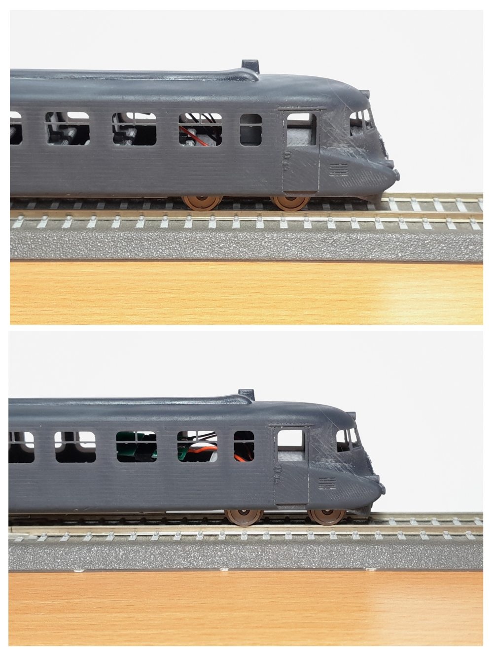 Níže přikládám pro porovnání fotky s podvozky v původní poloze (vnitřní dvojkolí ve správné poloze) a v poloze u čela (neodpovídá poloha žádného dvojkolí). Při bočním pohledu je řešení s podvozky u čela takové "strelovější", bohužel poloha v oblouku to aspoň pro mne vizuálně dost degraduje. Nevím vlastně pro co se rozhodnout. řešení s kratším rozvorem je provozně spolehlivější a má nějakou rezervu na podkročení oblouku R310. Druhé řešení je v R310 na hraně bez rezervy...