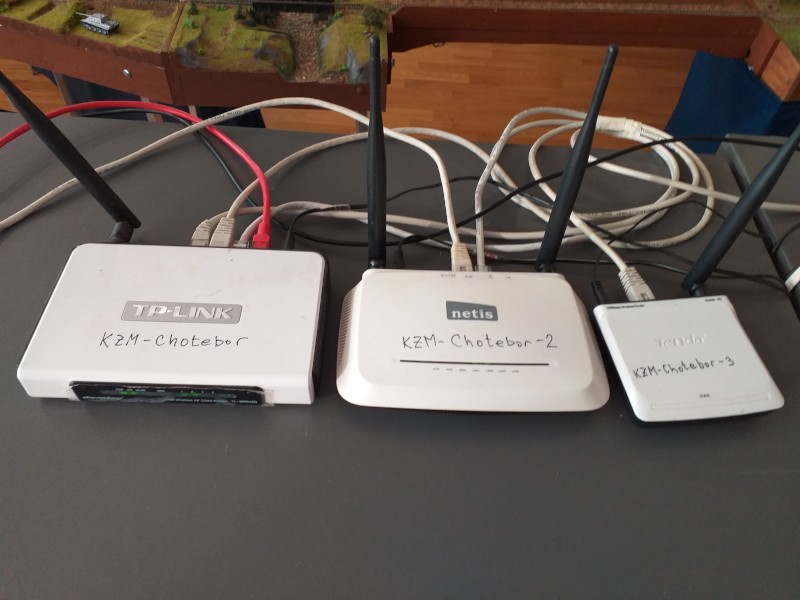 Vestavěnou WiFi centrály nepoužíváme. Ze zkušenosti potřebujeme mít farmu tří běžných domácích WiFi routerů v režimu AP. Všichni uživatelé, to jest výpravčí s prohlížečem na tabletu a strojvedoucí s Engine Driver na telefonu, přistupují k JMRI přes WiFi síť.