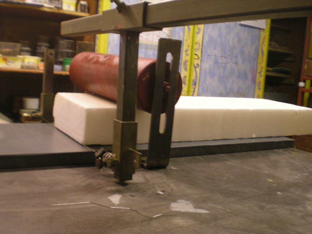 Ahoj, jiz delsi dobu jsem chtel rezacku poradne vyfotit, protoze v dilne na to nejsou moc dobre svetelne podminky, ale dam sem alespon par nekvalitnich fotek. Rezacka je udelana jako mobilni stroj (pridaji se k ni nohy), umi rezat vodorovne i svisle a to i v uhlech. Rezat se stim daji plotny na cca 1mm minimalni tloustku. Co se tyce sirky rezu, tak ten styrodur co je tam polozeny je cca 20cm siroky. Cim je ten rez delsi, tim pomalej se musi jet a tim vice se ma snahu drat houpat. Musi byt hodne naply a i tak rezat celou plotnu tj.50cm by byl asi problem.