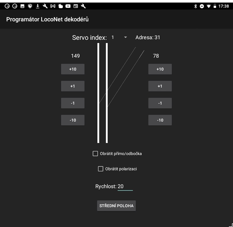 Kliknutím na "STŘEDNÍ POLOHA" se servo přestaví do střední polohy, což umožní instalaci přestavníku do ideální polohy. Následně se pomocí číselných poliček vlevo a vpravo od symbolu výhybky nastaví po jednom stupni krajní polohy (kliknutím na symbol výhybky uprostřed se výhybka přestaví do opačné polohy). Čtvereček pod symbolem výhybky "Obrátit přímo/odbočka" umožňuje sesouhlasit polohu výhybky na kolejišti s tímto symbolem. Další čtvereček "Obrátit polarizaci" umožňuje nastavit polaritu na výstupu pro napájení srdcovky (dekodér Servo 5 má pět relé pro připojení srdcovky, není tedy třeba mít na přestavníku žádný pomocný kontakt). Menší dekodér Servo2 ale tato relé nemá. Položka "Rychlost" umožňuje pohodlné nastavení rychlosti přestavení.